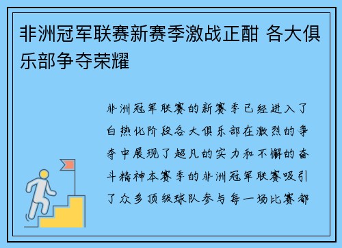 非洲冠军联赛的新赛季激战正酣,各大俱乐部在比赛中展现了超凡的竞技水平与战术智慧。无论是传统豪门的强势表现,还是新兴势力的崛起,都让这项赛事充满了悬念与看点。球员们的精彩表现、战术的不断创新以及非洲足球未来的发展,都是本赛季非洲冠军联赛的亮点。